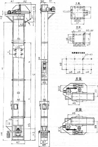 TD型斗提机外形见图1,主要尺寸见表3,驱动装置配套及尺寸见表4-表6,选用YZ型驱动装置时,其安装尺寸与制造厂联系。