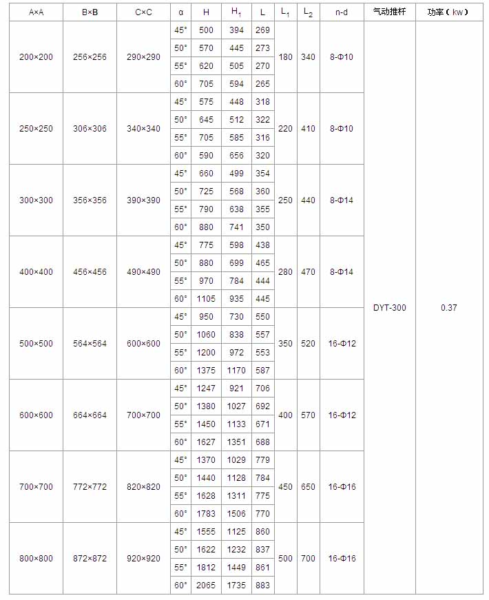 | A×A | B×B | C×C | α | H | L | L1 | L2 | n-d | 电动装置 | 功率(kw) |