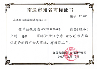江苏振强机械科技股份有限公司 >> 公司简介 >> 资质证书 >> 南通市知名商标证书