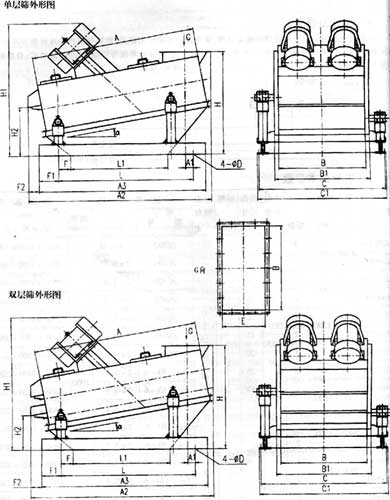 型号  |              筛面规格mm(长×宽)  |              筛面层数  |              入料粒度(mm)  |              筛孔尺寸(mm)  |              振幅(mm)  |              筛面倾角(°)  |              振动电机  |              外形尺寸mm(长×宽×高)  |         ||