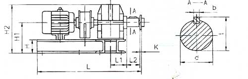 | 驱动装置 | 电动机 | 减速器 型 号  |             A | B | C | D | E | n-d1 | H | H1 | H1 | K | L | L1 | L2 | B1 | B2 | b | t | d | 重量 kg  |         |