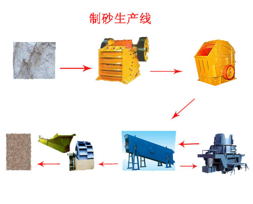 制砂生产线有振动给料机、颚式破碎机、制砂机、振动筛和胶带传输机等设备组合而成。根据不同的工艺要求,各种型号的设备进行组合,满足客户的不同工艺要求。