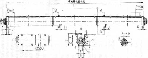 一号彩票注:1、螺旋机输送长度及尺寸L均见表二、表三。 2、图n×500为盖板卡子尺寸,n值视螺旋机长度而定。 3、图中尺寸p为进出料口中心线。